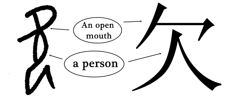 Though in its origin this character, even being related to a person, has a not so clear relation with the character for person 人, now, the evolution of language made it similar. In the upper part of the person a "cubist" representation of an open mouth has been added.